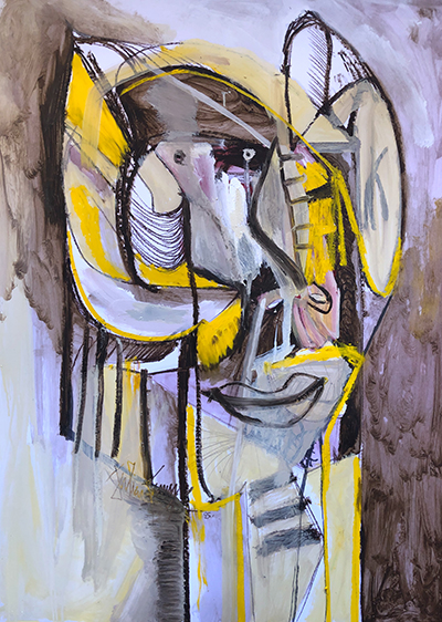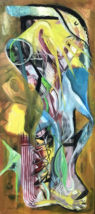 Il est là, debout, vertical et ancré. Il va comme toujours entamer la toile d’emblée sans préalable, à même le lin brut. C’est la couleur qui sert son geste intuitif, nerveux, spontané dans une exploration vivante et complexe du langage pictural. Dans cette danse, les forces originelles et chaotiques vont lentement se canaliser vers une botanique étrange et organique. Malgré une impression de foisonnement, chaque oeuvre est en fait une recherche profonde d’équilibre et de sens, un combat visuel, un dialogue intérieur, entre abstrait et figuratif, entre réflexion et abandon ludique.